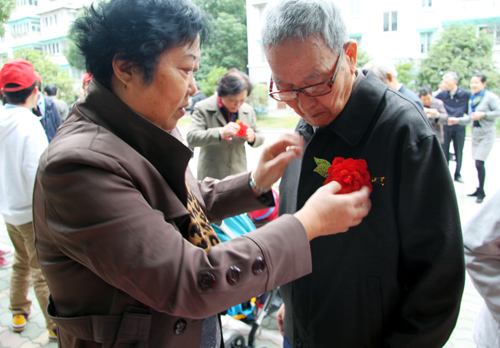 海曙新闻网讯(记者张立)金风送爽,丹桂飘香。10月25日上午9时,安丰社区为30对金婚老人举行拍照活动。活动现场,热闹非凡,志愿者为前来拍照的老人佩戴上胸花;“红玫瑰手工坊”的义工们则为老人送上精心编制的幸福手链和手工制品,老人们乐得呵呵直笑,称赞社区为他们搭建了一个幸福平台。
