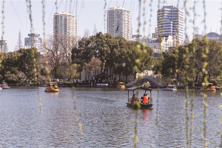 2月20日,海曙入春,较常年提早18天。天一阁·月湖国家5A级景区暖风习习,柳枝抽出新芽,湖面波光粼粼,市民泛舟湖上,一片盎然春意。(沙燚杉摄)