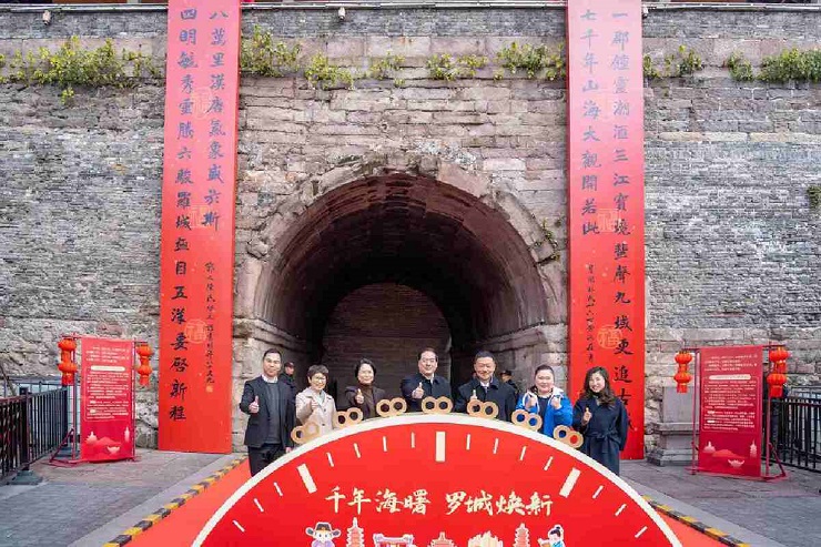 千年罗城,小年纳福。2月11日上午,“天驷巡城·甬迎新辰”宁波罗城送万福活动在鼓楼城楼南侧广场、开明街89号“返场”(考试院)举行,同叙文脉、共迎新春。市政协副主席高庆丰,上海师范大学党委书记林在勇,区委书记叶枝利会同道德模范代表孙嘉怿、劳动模范代表刘建丽、罗城推荐官代表邵紫丹、国家金牌导游代表周震宇共同为巨幅春联揭幕;会同区委副书记、区长徐洪涛,市委宣传部副部长、市文明办主任童华斌,市住建局副局长沈浩,市文广局一级调研员陈延群共抛彩带宣布“返场”开业。区领导张启表、张宁辉、邬旻、毛孟军、黄列、陈旭伟等出席活动。活动现场,首映了宁波罗城街采短片《千年海曙·罗城焕新》,专家解读了楹联寓意并赠诗,开明街89号“返场”商户代表、宁波九中校友代表作了分享。海曙区“百人写福千人送福万人纳福”迎春活动同步举行。